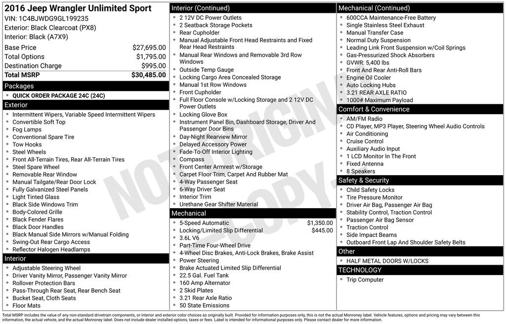 2016 Black Clearcoat Jeep Wrangler Unlimited Sport has a clean carfax. This Jeep Wrangler has many features and is well equipped including, 16" x 7.0" Luxury Styled Steel Wheels, Compass, Half Metal Doors w/Locks, Outside temperature display, Plastic Front Door Window, Quick Order Package 24C, Sunrider Soft Top, Variably intermittent wipers. Come in today or call us now at 440-988-4484!